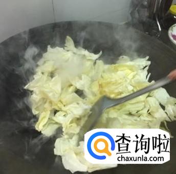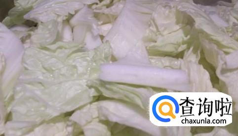 然后放切好的白菜。为了使白菜受热均匀达到全熟,先放梗部分,再放菜叶部分。