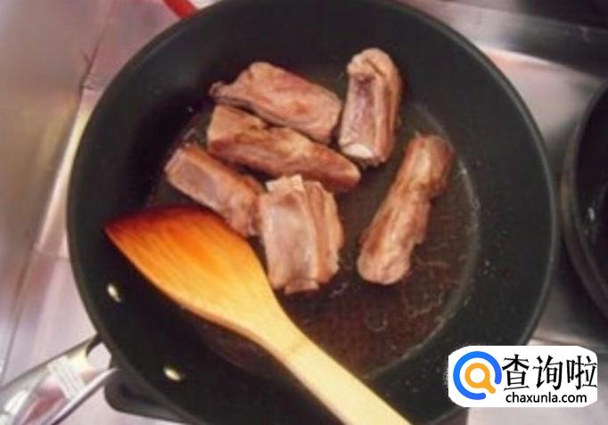 然后将锅烧干放一点油烧热,将排骨倒进去翻炒,这是很重要的一步,能够使脂肪和油溶解,让汤更容易熬成奶白色。
