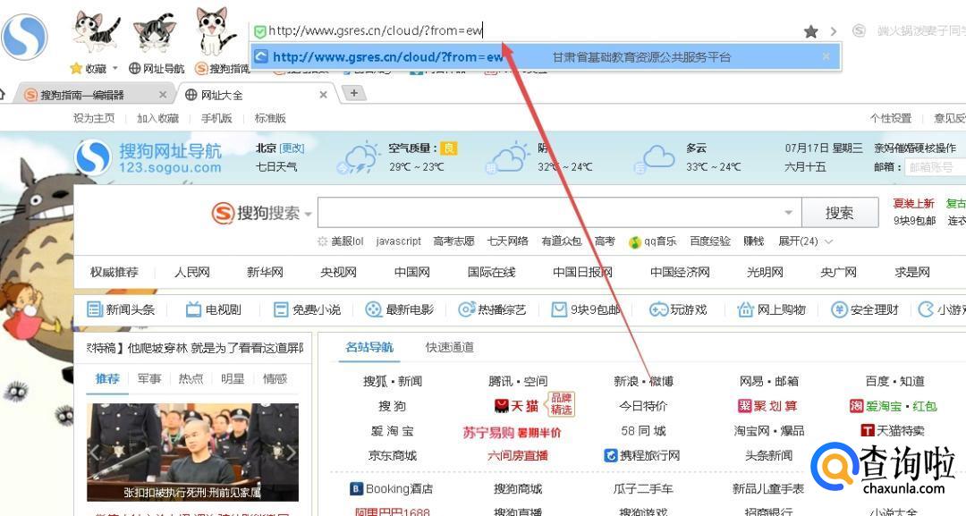 首先,找到学生所在地的人人通网址,我们以甘肃省为例。甘肃省人人通的网址是“http://www.gsres.cn/cloud/?from=ew”,在搜狗高速浏览器中输入网址搜索。