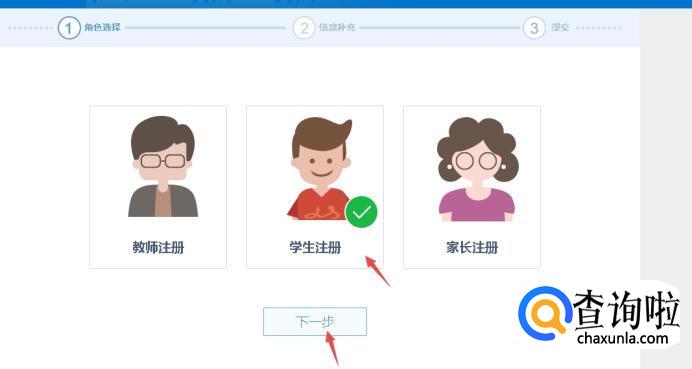 选择角色,我们以学生为例子,选择“学生注册”,点击“下一步”。