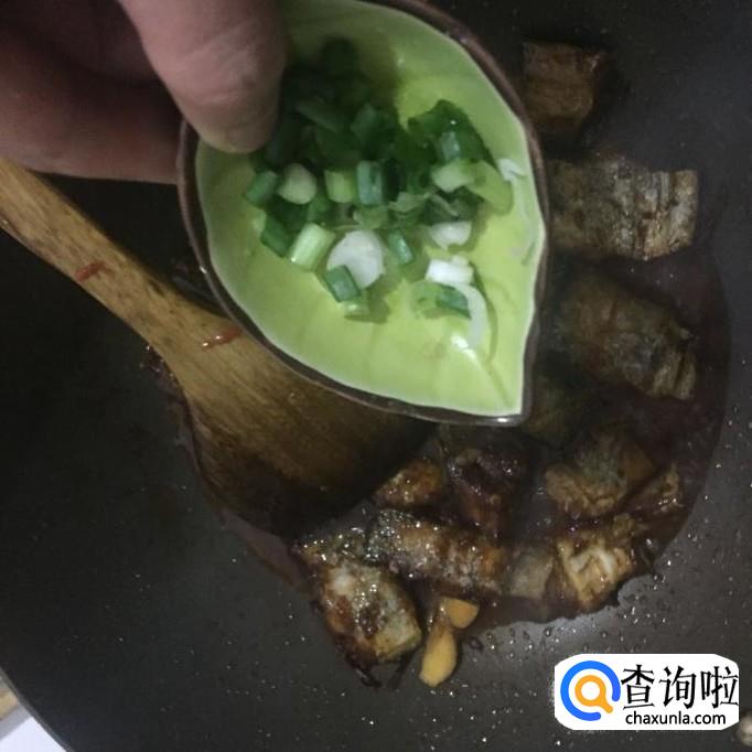 把炸好的带鱼段倒入锅中翻炒两分钟,香葱切成葱花倒入锅中翻炒一分钟就可以出锅了。