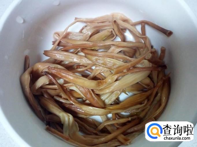 把干黄花菜放入温水中泡发变软,然后收拾清洗干净,控干水分。