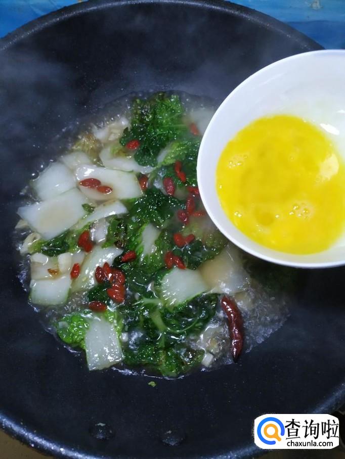 乌塌菜适量,枸杞子适量,鸡蛋适量,盐适量,鸡精适量,干辣椒适量,蒜适量。