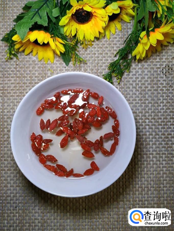 加入适量清水,再准备适量枸杞,用清水泡开后,放入锅中,大火将水烧开,水开后转小火煮三分钟左右。