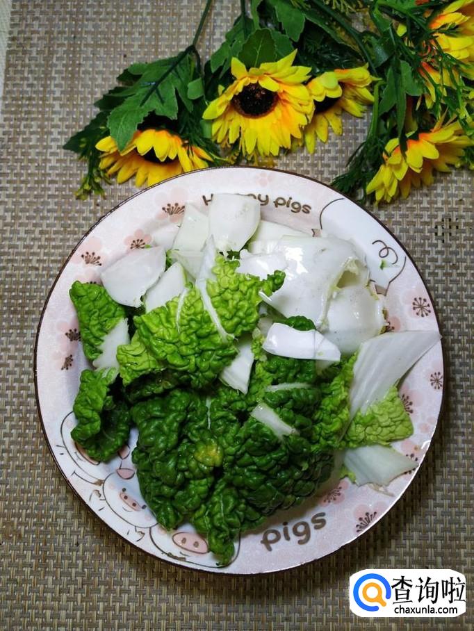 准备适量乌塌菜,用手撕开,洗去根部的泥沙,然后再用刀切成片,沥干水分,放入盘中备用。