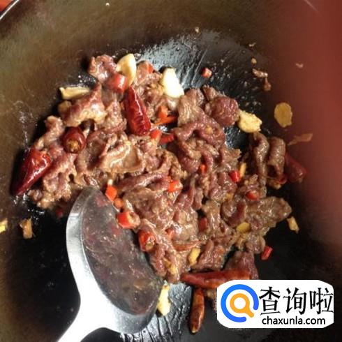 锅中倒入油,油热之后倒入牛肉快速翻炒,变色之后马上盛起。