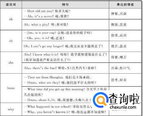 感叹词是在句子中表示强烈的喜怒哀乐情绪或感情的词,不能作句子成分。比如:Ah、Oh、Hurrah等。