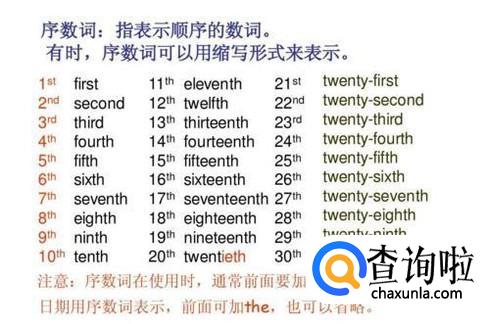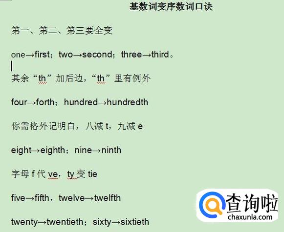 分为基数词和序数词两种。基数词表示数目多少的数词叫基数词,如one 一、two 二等;表示顺序的数词叫序数词。例如:first 第一、second 第二等。两者之间的转换规则可以看看下图一,而对于一些不规则的基数词变序数词可以参照图二的口诀记住