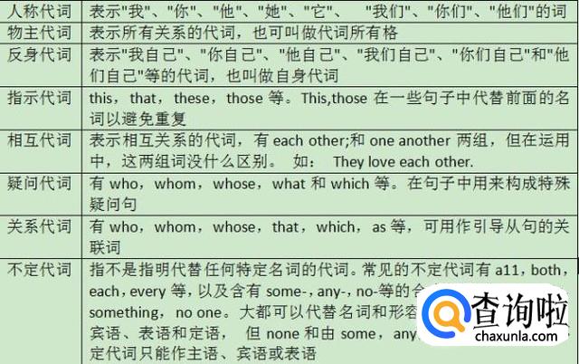 代词是代替名词的一种词类。英语中的代词,按其意义、特征及在句中的作用分为:人称代词、物主代词、指示代词、反身代词、相互代词、疑问代词、关系代词和不定代词八种。