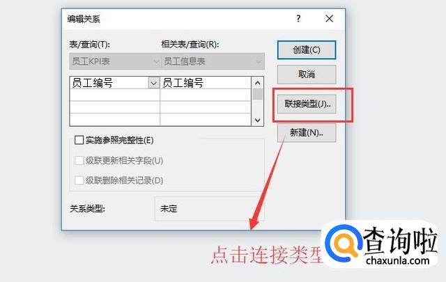 拖动员工编码以后会自动弹出编辑关系的界面,这里我们点击联接类型按钮,如下图所示