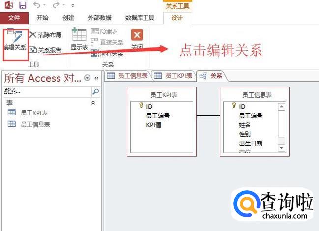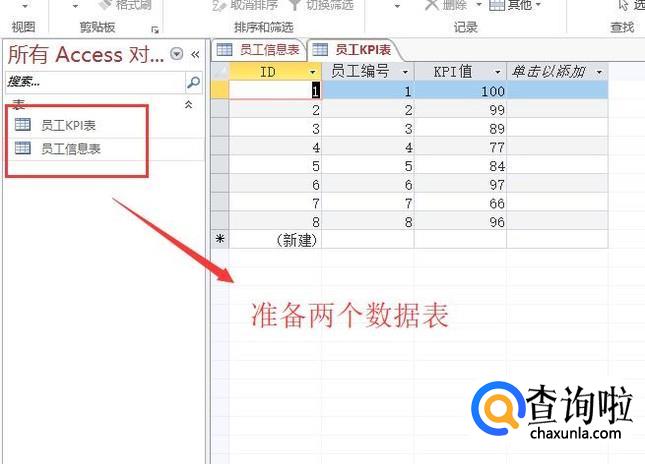 首先我们打开Access数据库,准备两个数据表,如下图所示,两个数据表之间通过员工编号进行关联