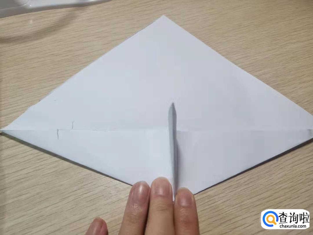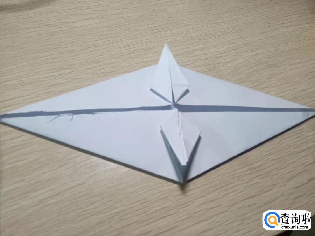 一角向右折并展开,按折痕翻到右面,将一角向里对折并收到一起。前面展开,向中间折,相连的地方撑开,另一边方法相同,将尖向里收,并到一起,将小角翻开后折即可。
