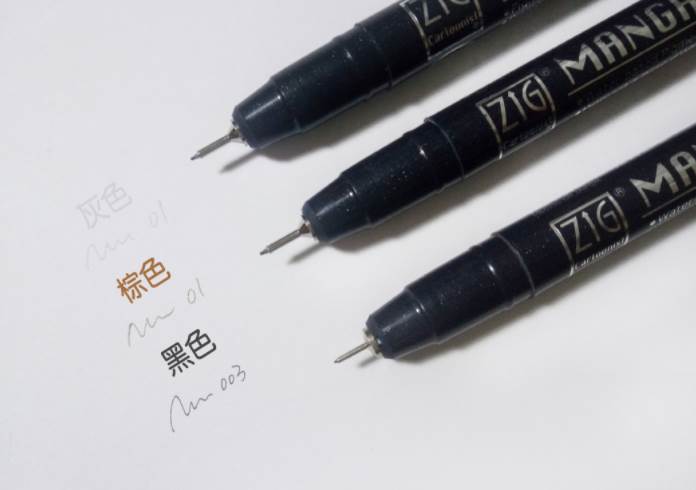 油性勾线笔一般为双头,一头为圆头较粗,一头类似水性笔的笔头,油性勾线笔的颜色较为单一,大多为黑、蓝、红三种颜色,多用于标记和插画创作使用。油性勾线笔相比较水性笔价位较低,易于携带,颜色附着力极强不易清洗。