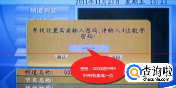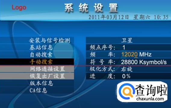 在系统设置界面,输入9999,进行“手动搜索”,设置“频率12020MHz,符号率28800Ksymol/s,极化方式右旋”,即可接收1套测试信号节目。