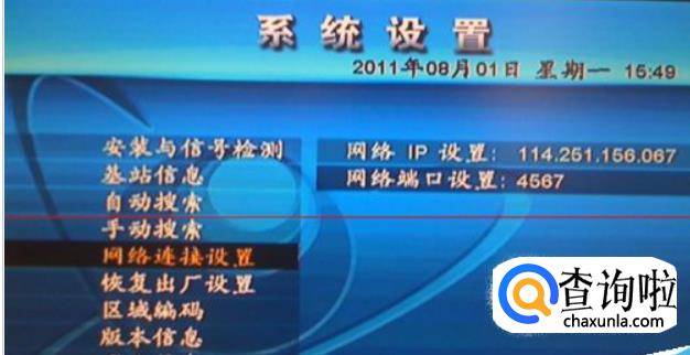 选择“网络连接设置”界面,输入前端位置锁定服务器IP地址(114.251.156.067)和端口号(4567),以便在开卡时机顶盒将相关信息发送到前端位置锁定服务器。