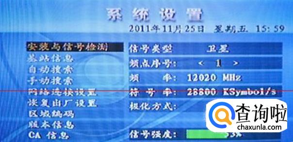 查看“安装与信号检测”下信号强度和信号质量,先调整好天线的仰角,使信号强度和信号质量显示值最大。
