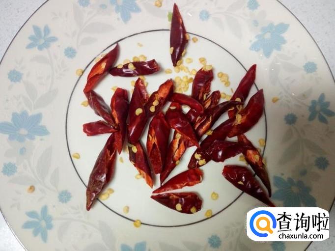 红干椒用水清洗干净,控干水分,斜刀切成段。切好葱,姜,蒜,备用。