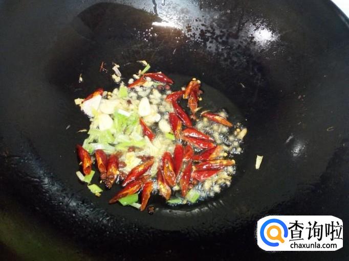 锅里放入油加热,油热后放入花椒,红干椒,葱,姜,蒜,爆香。