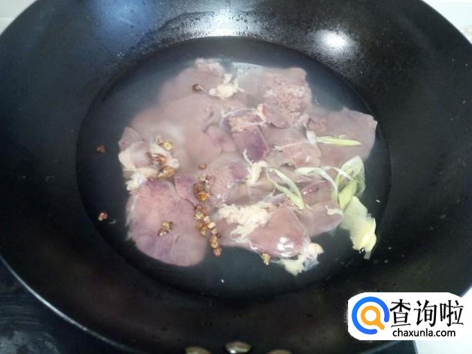 锅里放入水,放入控干水的鸡肝,再放入花椒,八角,少许盐,葱,姜,把鸡肝煮熟。