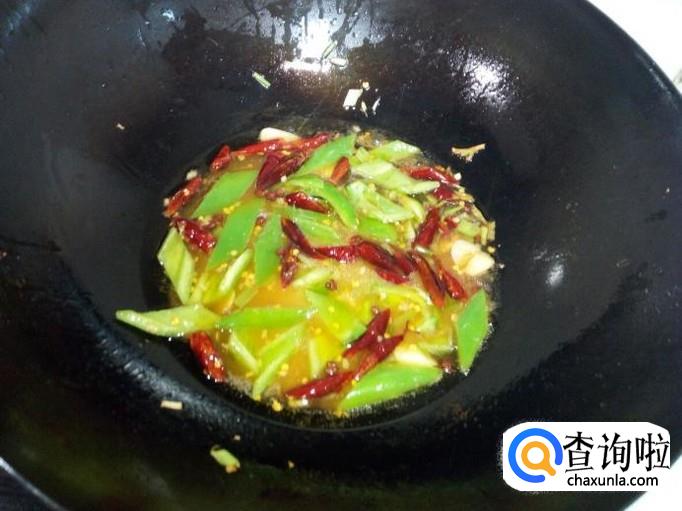 放入青尖椒略翻炒一下,随即放入调和好的料汁,稍熬一下。
