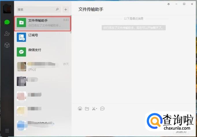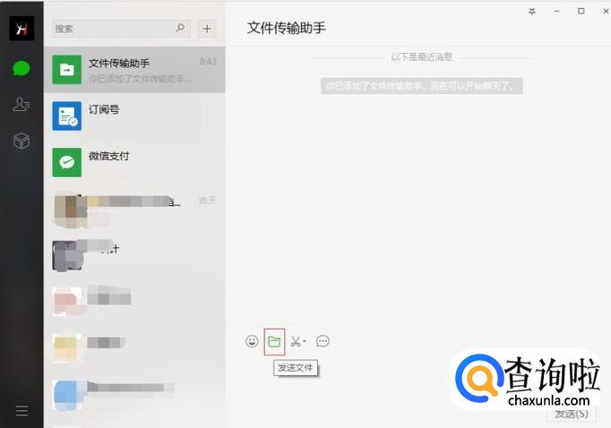 登录完成就会自动弹出微信界面,如图,我们在左边找到文件传输助手选项打开。点击文件传输按钮,然后选择想要传输的文件发送即可