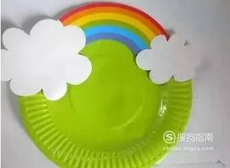 用透明胶水将彩虹和云朵粘贴在纸盘上,要记得在彩虹的两边都粘贴上云朵哦。