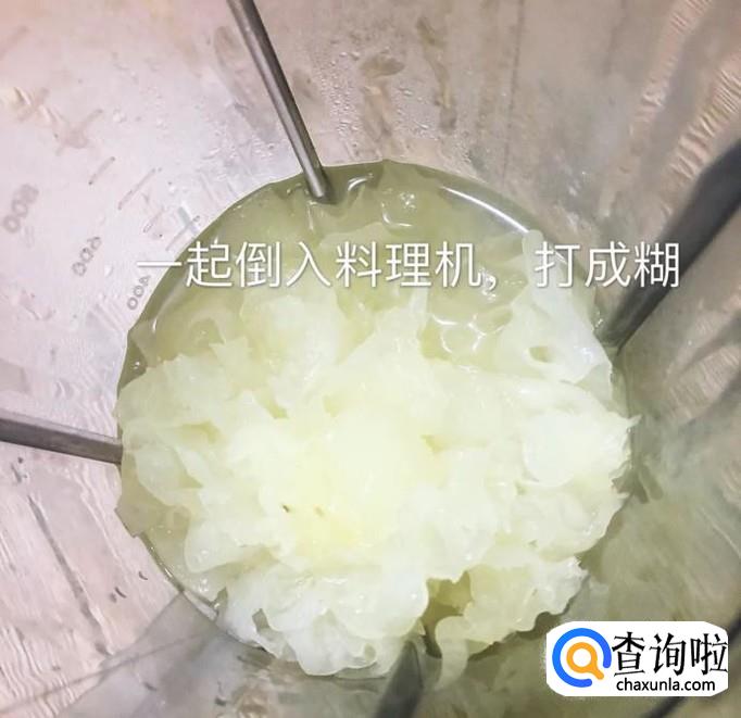 然后将煮好的银耳连汤汁一起倒入料理机中打成糊,如下图所示。
