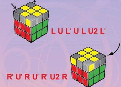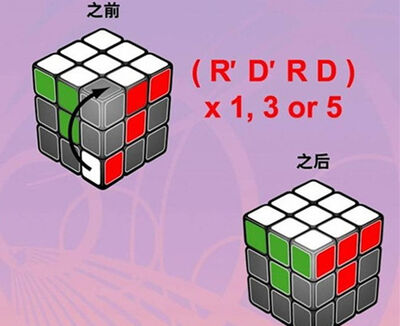 第二步:完成第一步后,然后直接套用公式(R'、D'、R、D)×1,×3或×5(可多弄几次直到完成为止),通俗口诀,右边逆时针旋转90度、底层逆时针旋转90度,右边顺时针旋转90度然后底层在顺时针旋转90度。
