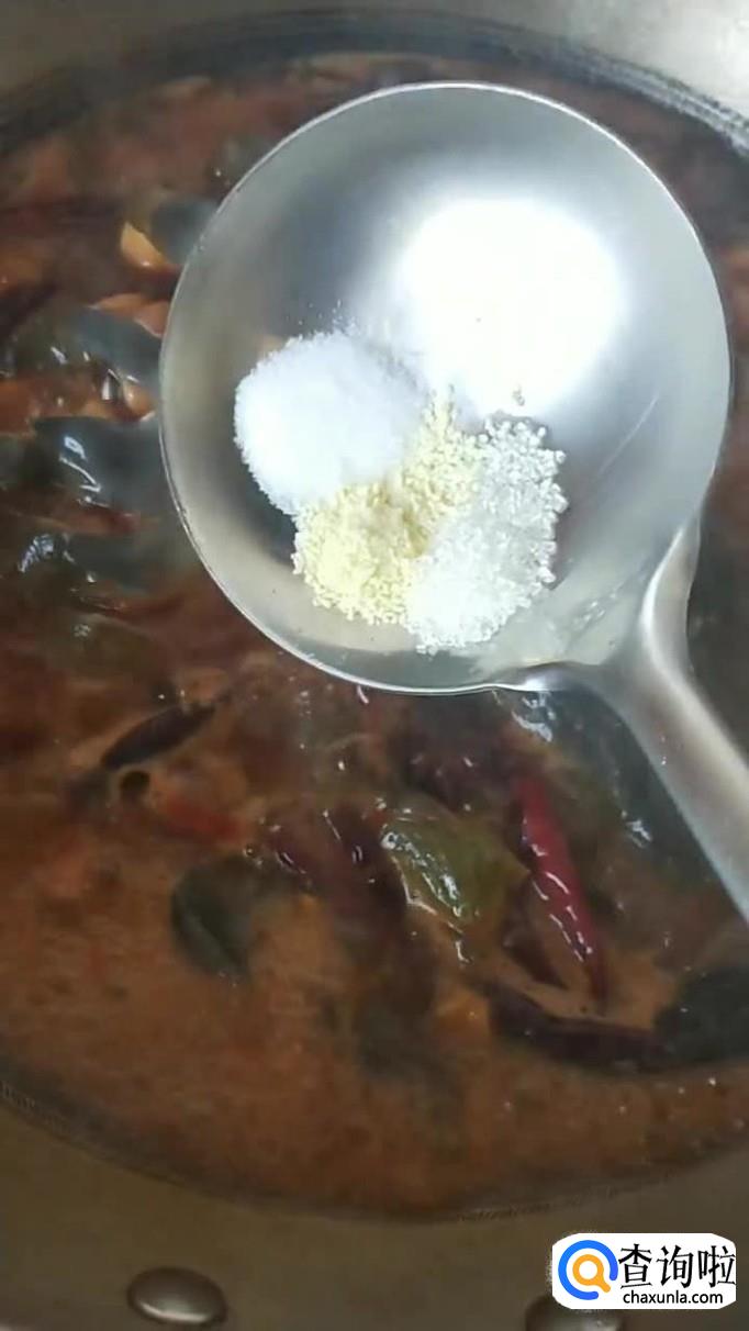 然后往锅中加入适量的盐巴和味精,开小火焖煮15分钟,如下图所示。小贴士:大家在焖煮鲶鱼的过程当中,要用勺子不断的把汤汁浇淋在鲶鱼上会比较好,这样做方便鲶鱼入味。