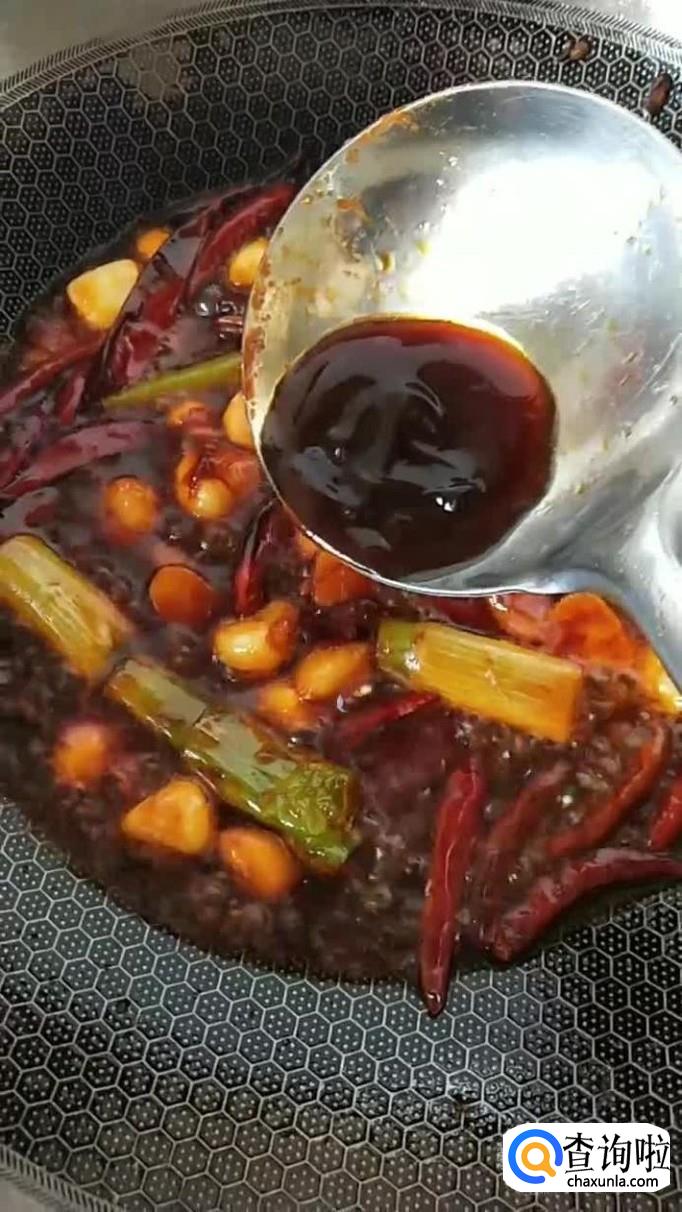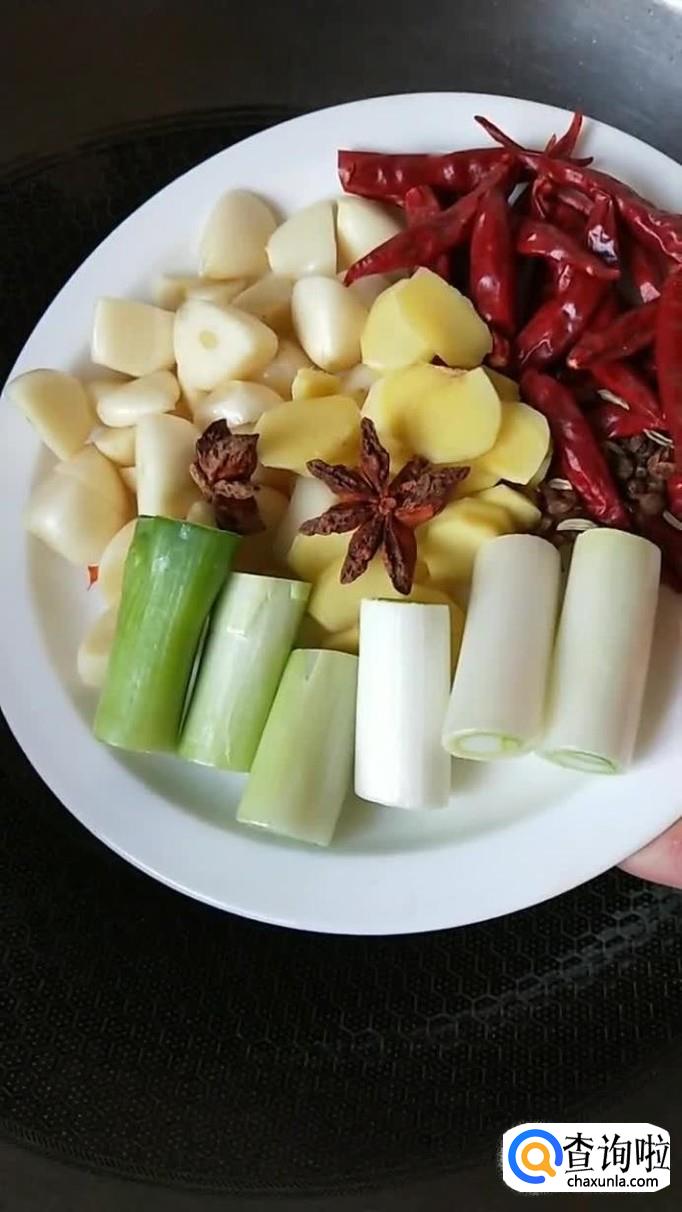 接着锅中放入适量的食用油,待油冒烟倒入大蒜,蒜头,生姜,八角,干辣椒,花椒爆香,如下图所示。