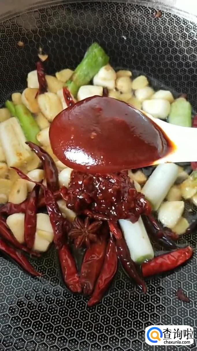 然后往锅中加入两勺的辣椒酱,翻炒一分钟,如下图所示。