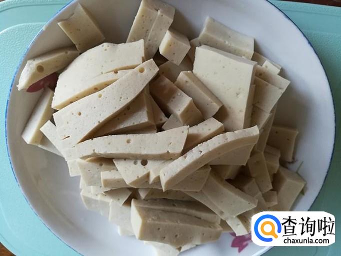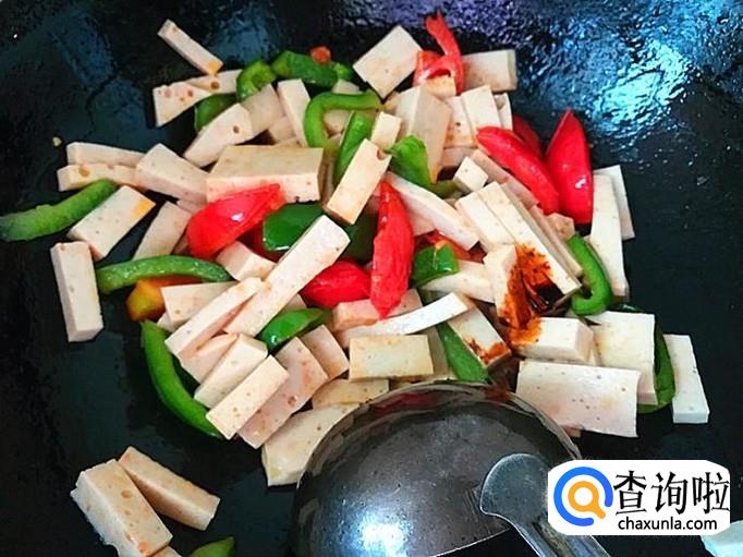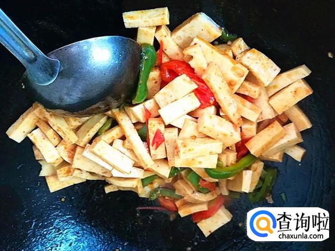 加入前面准备好的千层豆腐一起翻炒一会儿,再加适量的食盐继续炒片刻。
