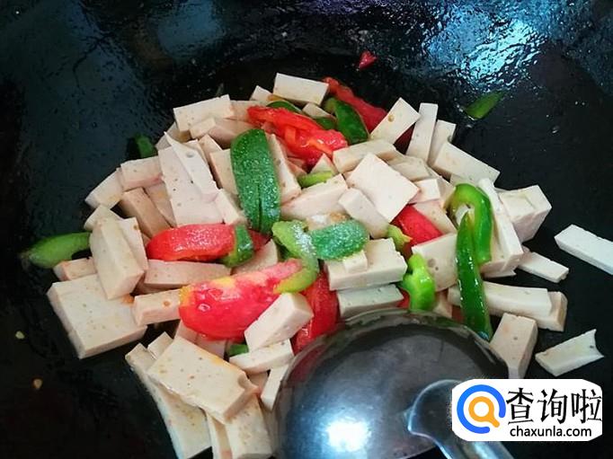 装盘,一道营养丰富好吃的西红柿青椒炒千层豆腐就做好了。
