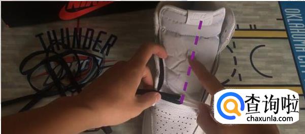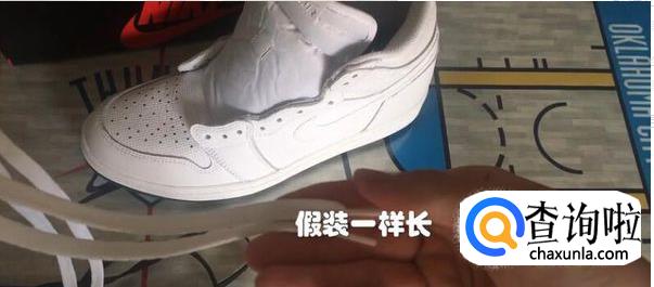 交叉后拉直鞋带检查下鞋带两端是否一样长,注意黑色、白色两端都要对齐。