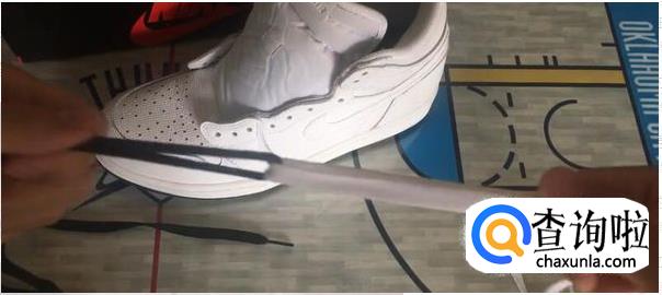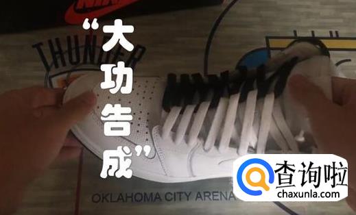 取两种不同颜色的鞋带各一根,将鞋带交叉系起来。温馨提示:对于大多数AJ1,黑白鞋带都是白搭的。