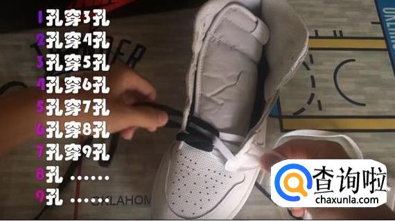 将白色一孔鞋带穿入黑色鞋带后在穿入同侧3孔,然后拉紧两端整理。