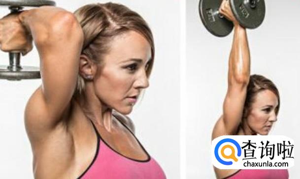 首先是站姿哑铃臂曲伸,将哑铃深深举过头顶,上下轻轻摆动,有利于减轻手臂的负重,也可以促成肌肉的生长。