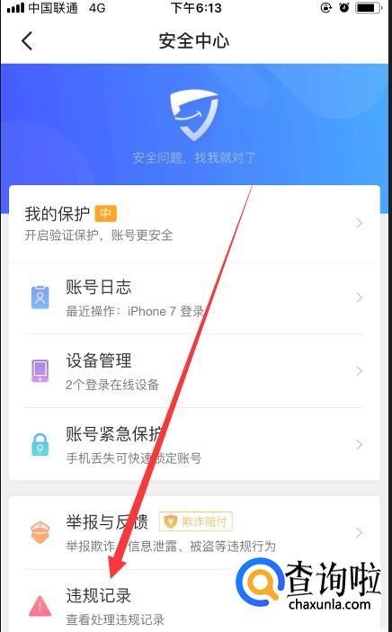 在个人界面中下划,找到并点击【安全中心】选项,如图所示。