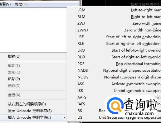 然后右击空白区域并点击插入Unicode控制字符,如下图所示。