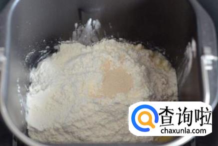 将高筋面粉、鸡蛋、酵母、牛奶、糖、盐放入面包机中,点和面功能,面包机就会自动和面。