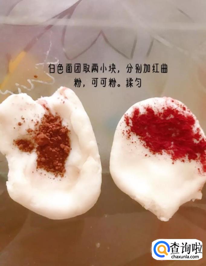 然后取两个白色的面团中间分别加入红曲粉和可可粉揉匀,如下图所示。