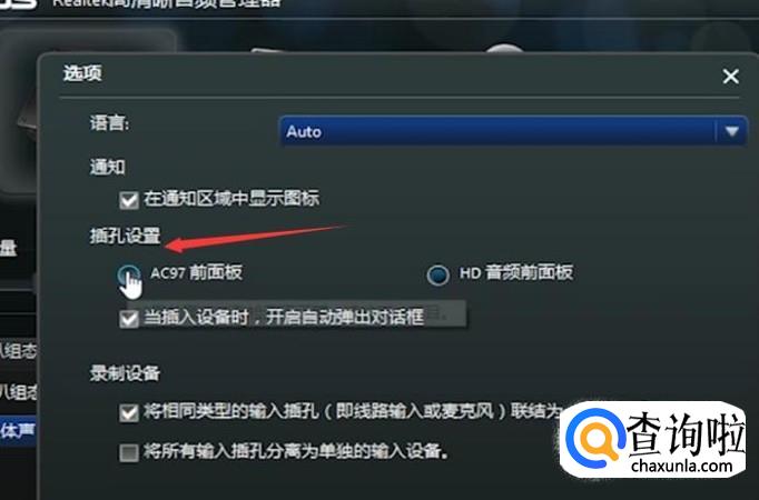 在“插孔设置”上勾选“AC97前面板”即可