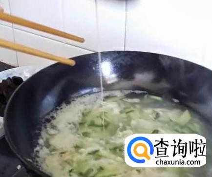 将老黄瓜片放入锅中,用铲子翻炒。