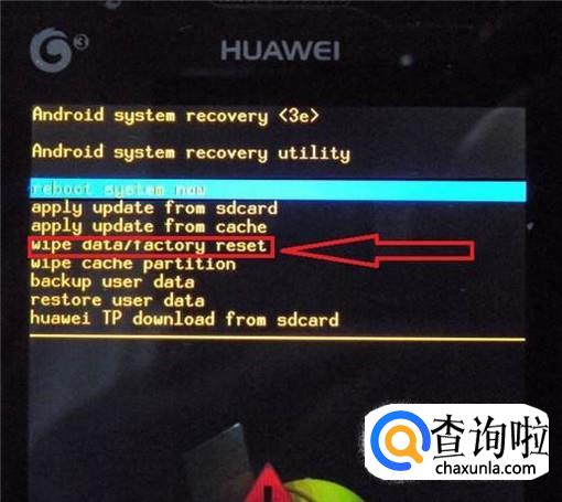 使用音量键上下移动,选择Wipe data那一栏,用电源键代替确定功能,清除。