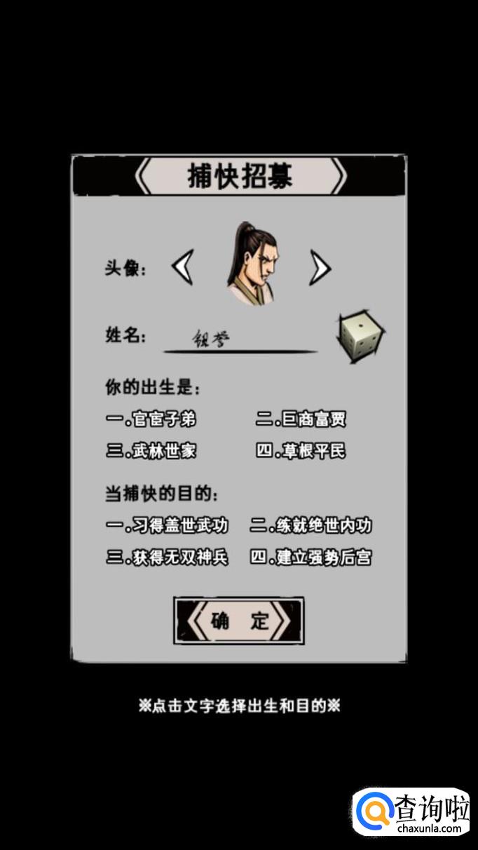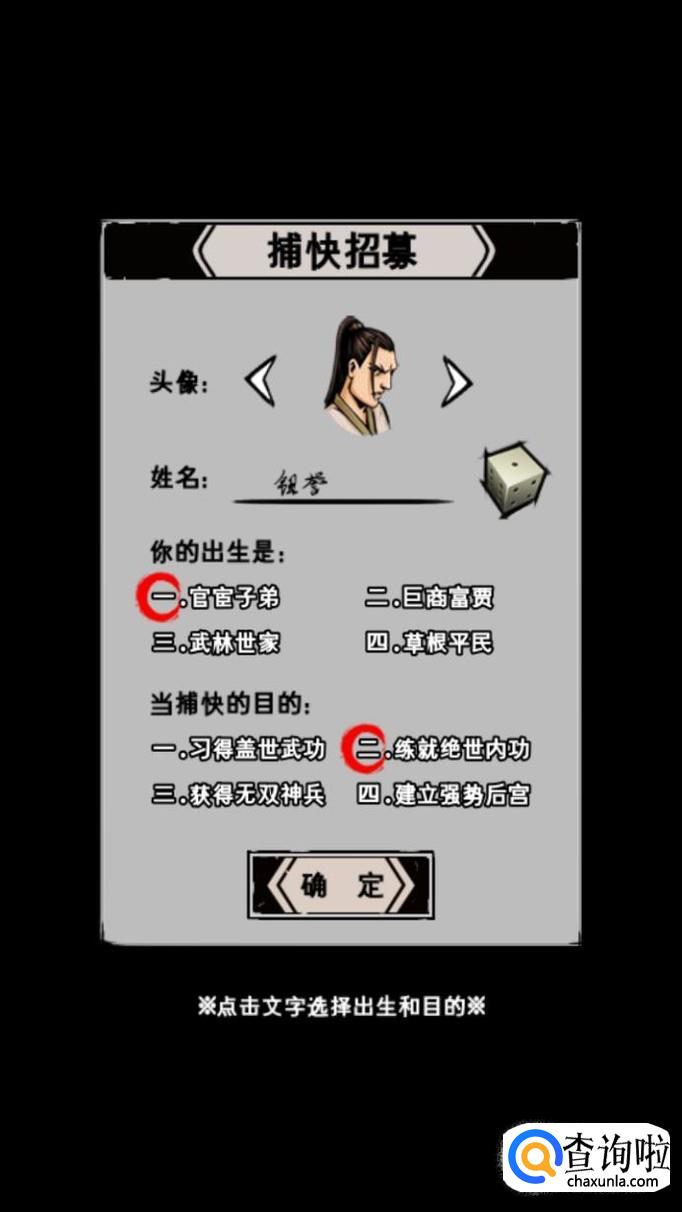 这时它会弹出让你选择英雄属性的界面(捕快招募令),填写你的名字(旁边有骰子可以随机选),你是世家出身还是平民出身,当捕快为了绝世神功还是神兵。