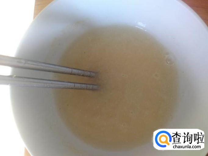 甜酒曲倒到碗里加3小勺水进去搅拌均匀。【甜酒曲按说明下料】