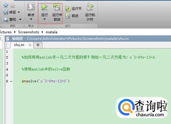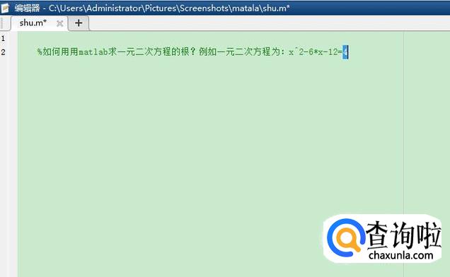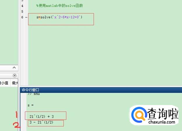 以一元二次方程为:x^2-6*x-12=0,为大家分享一下用matlab求一元二次方程的根的方法。