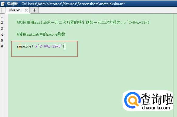 在matlab的shu.m文件中输入:s=solve('x^2-6*x-12=0')
