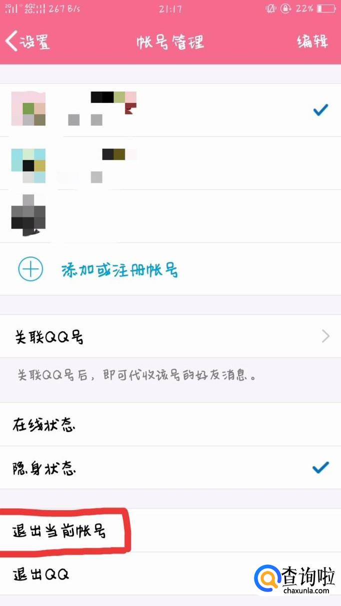 在此只需要选择屏幕顶端的“退出当前账号”即可注销该QQ号的登录。