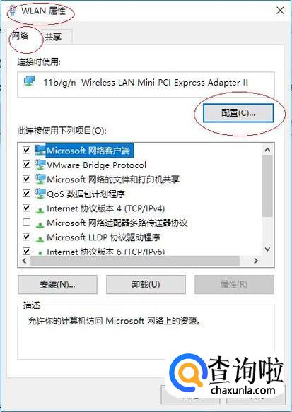 弹出"WLAN 属性"对话框,如图所示。选择"连接时使用"选项区域,点击"配置..."按钮。